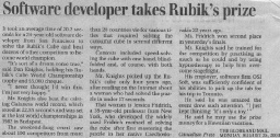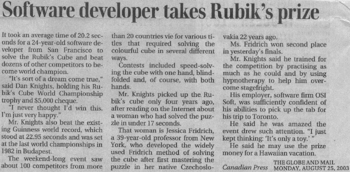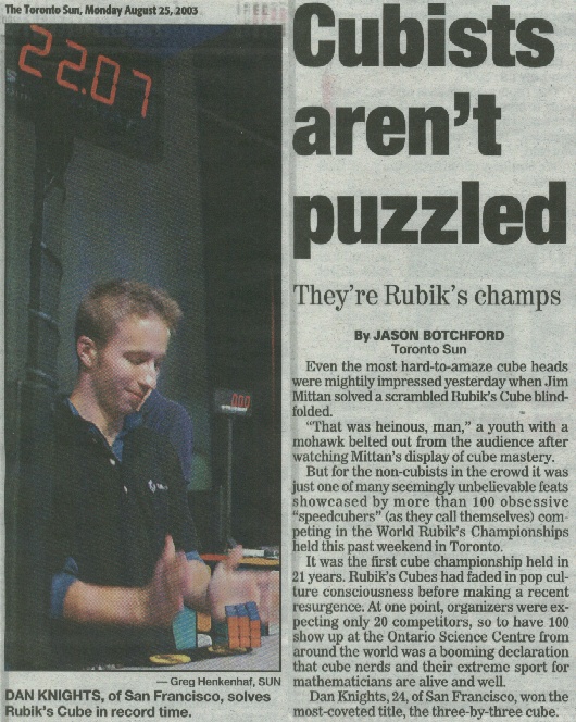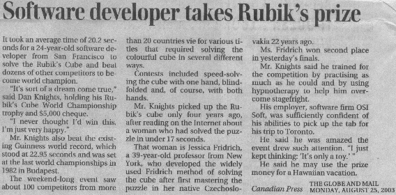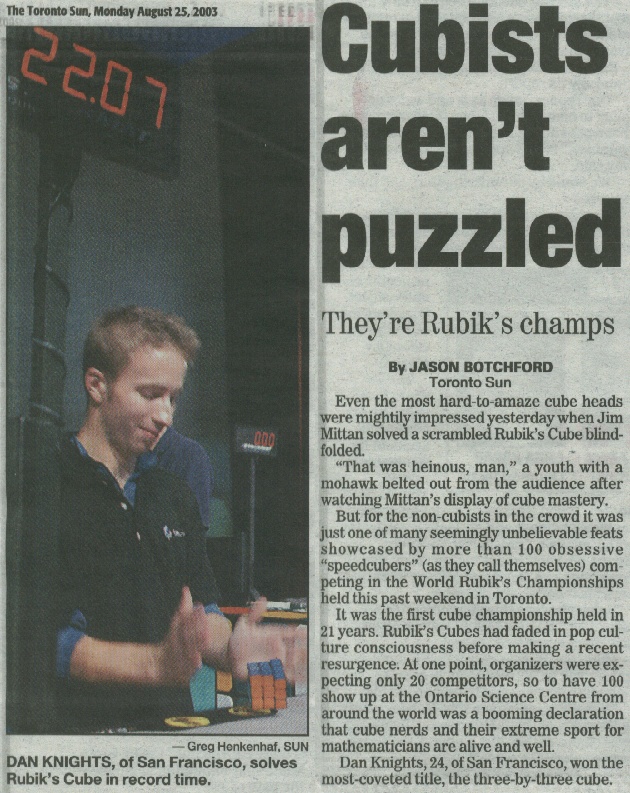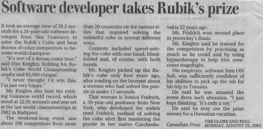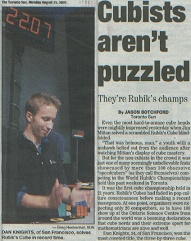 2003 Rubik's World Championship[2003-Oct-04]What to say? This event was anticipated by all in the cubing community for months, if not years. Quite a few of the "originals", who were active and competing back in the early 1980's were excited about the prospect of another meeting and competition. Even though it was a competition (high pressure, at that), it was also a reunion of many good friends who had already met, either on-line, in person, or both. The day after the end the competition, many had already left, or were on their way home. Before we even left Toronto, where the competition took place, we saw two newpaper articles. This one was in "The Globe and Mail", which was delivered to our room at the Crowne Plaza Hotel: